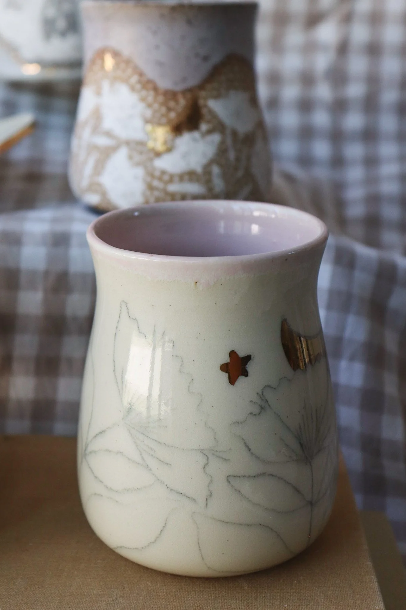 This 14oz hand-thrown mug features a matte exterior and glossy interior, accented with gold luster details and hand-carved patterns. The combination of textures and finishes makes this mug a truly unique piece.