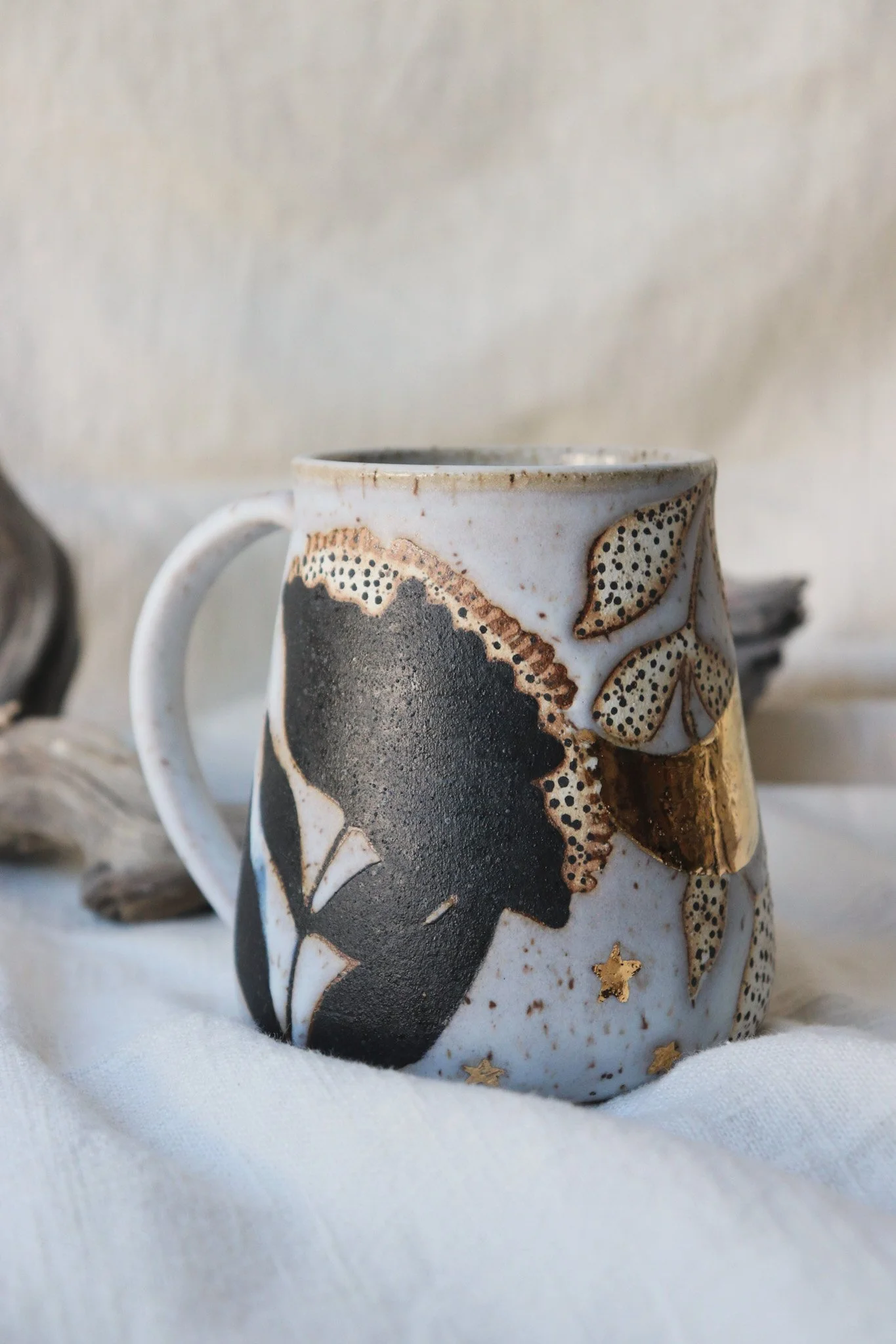 This 14oz hand-thrown mug features a glossy finish paired with gold luster accents for a sophisticated and modern design. Its clean lines and striking finish make it a standout piece in any collection.