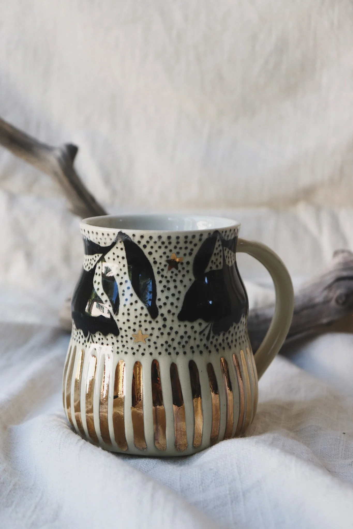 This 14oz hand-thrown mug features a glossy finish with gold luster and hand-carved details, giving it a unique texture and visual appeal. Perfect for enjoying your favorite beverage with a touch of artistry.