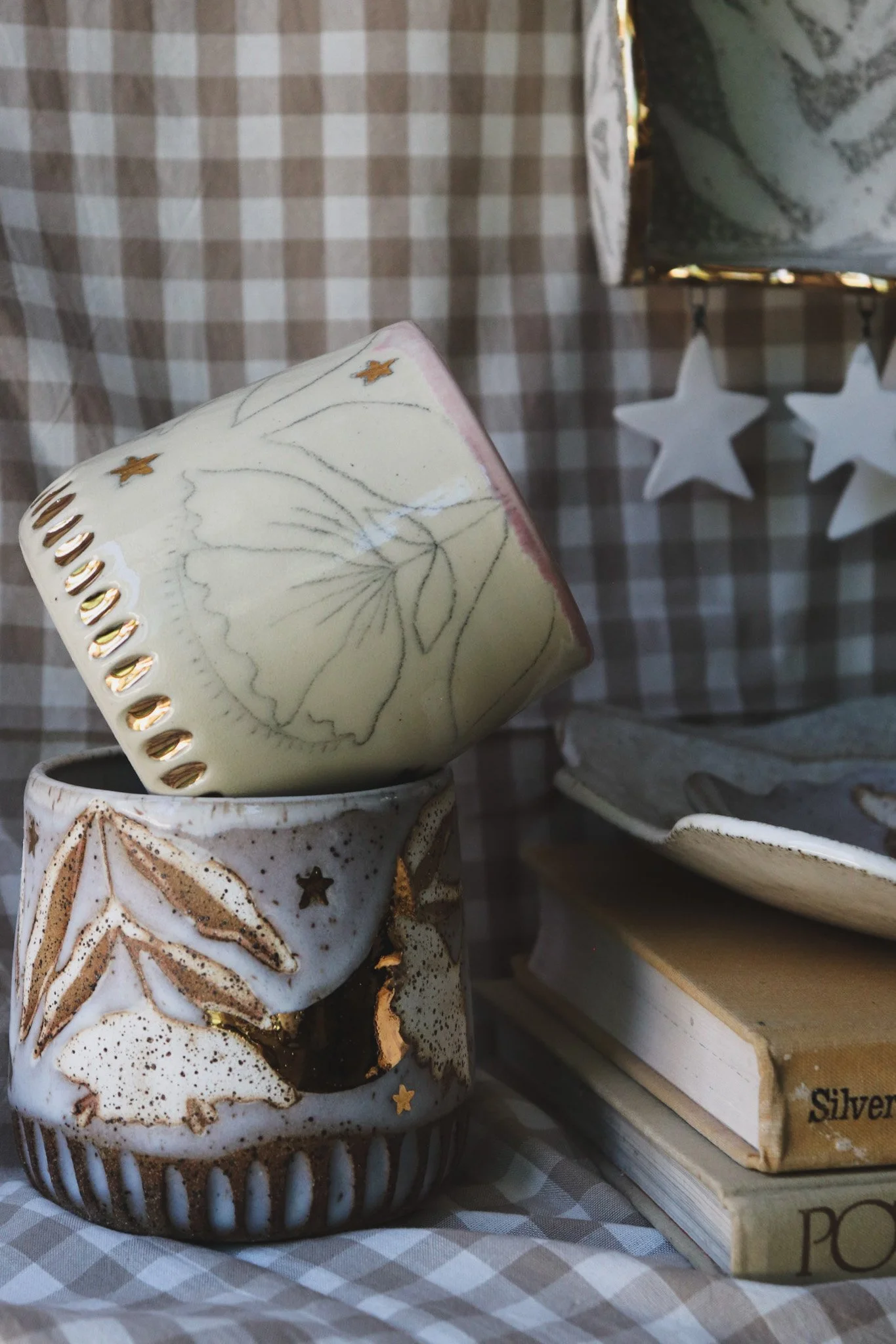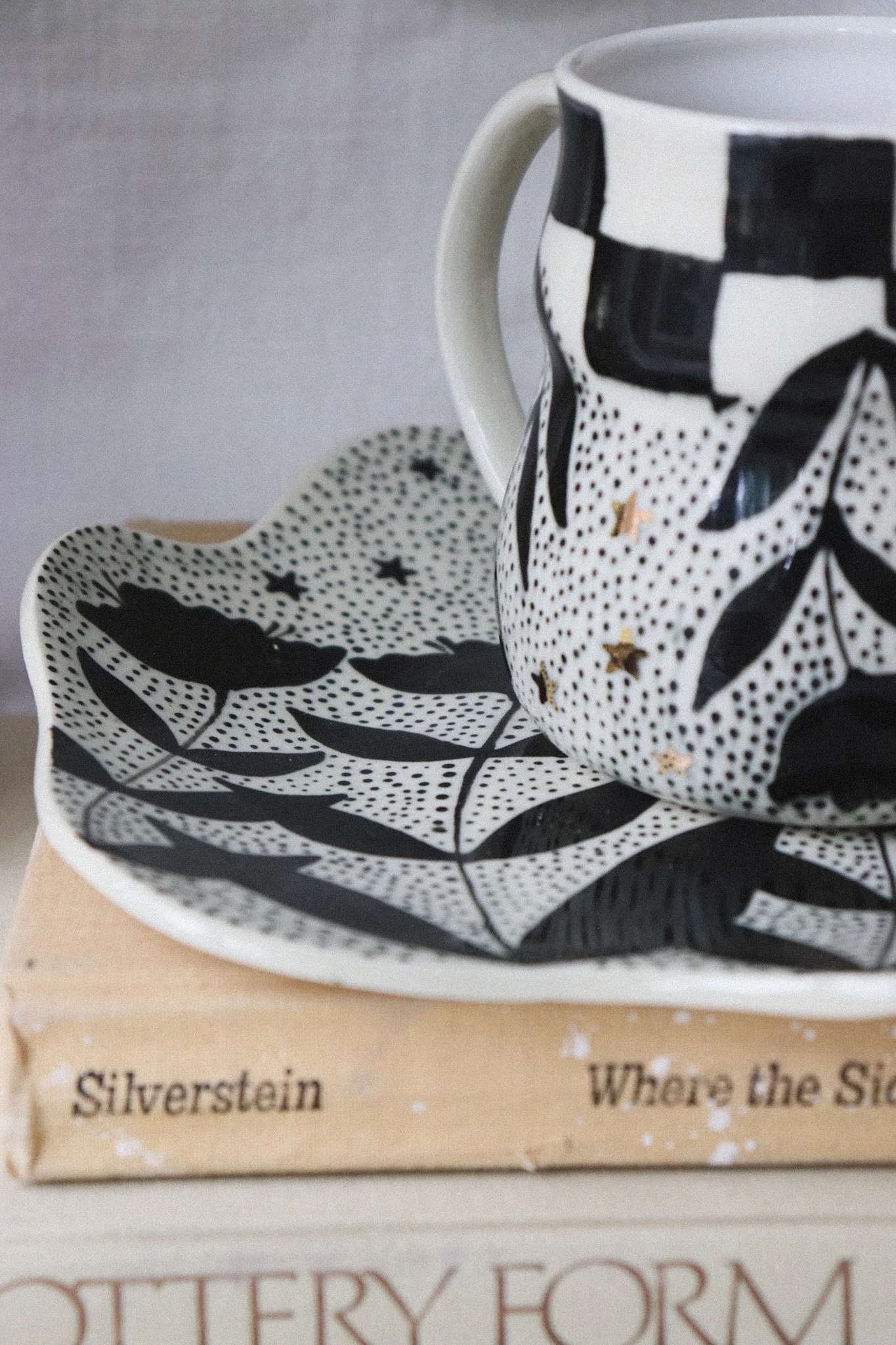 This elegant 12-inch tray is hand-built and hand-painted with underglaze, offering a unique design that blends both artistry and function. The glossy finish highlights the soft colors, while gold luster detailing adds a touch of luxury. The glossy pink bottom provides a playful yet sophisticated contrast, making the tray a standout piece.